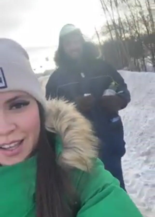 A woman in a green winter coat and a white knit hat is recording a video while walking in a snowy landscape. A man in a blue winter coat and a dark hat walks behind her. He is holding a bottle and a small container. The sun is bright and the sky is pale. Trees are visible in the background. The woman is looking directly at the camera and talking. The man smiles briefly.