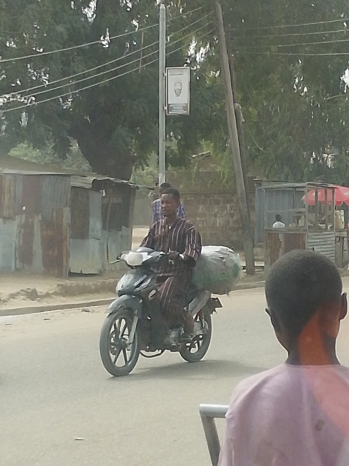 This image captures a daytime street scene in Hotoro North, Nigeria. In the immediate foreground, facing away from the viewer towards the middle ground, is the back of an individual's head and shoulders, wearing a light-colored, possibly lavender, garment. In the middle ground, a dark-skinned male operates a dark-colored Suzuki motorcycle, moving from left to right across the frame. He wears a long-sleeved garment with vertical dark and light stripes. A large, light-colored, possibly green, sack or bundle is secured to the rear of the motorcycle, extending behind the rider. The motorcycle has front and rear wheels with multi-spoke rims. The background features a dusty, paved road. On the left side of the road, several informal structures constructed from rusted or weathered corrugated metal sheets are visible. Behind these structures, a large tree with dense green foliage dominates the upper left. A light grey utility pole stands centrally on the left, adorned with a rectangular white banner displaying the word "TARBIYA" and a stylized depiction of a bearded face. Multiple overhead utility wires extend horizontally across the upper portion of the image. To the right of the motorcycle, a low stone wall is visible, behind which a small kiosk or stall-like structure with a red umbrella can be seen. Another individual in a white shirt is partially visible within or near this stall. Further individuals are indistinctly present in the left background, near the corrugated structures. The scene depicts general urban street activity.
