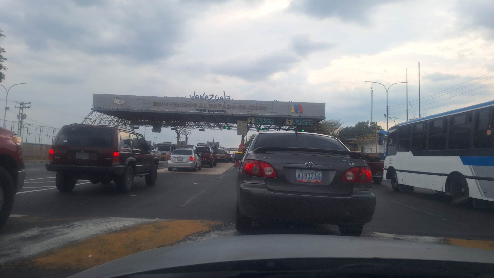 congested road leading to the "Bienvenidos al Estado Cojedes" gate, marking an entrance to Cojedes State in Venezuela. The sign also includes "Peaje Taguanes," indicating a toll station in the city of Taguanes. Several vehicles are visible, including a red Jeep Cherokee, a silver Toyota, and a gray Toyota Corolla with license plate AI932AK. A white bus with a blue stripe is on the right. The sky is overcast.