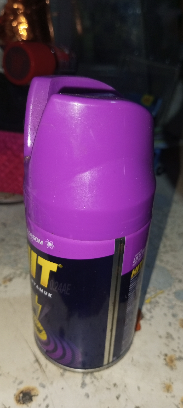 A purple Hit mosquito spray can stands upright on a speckled surface