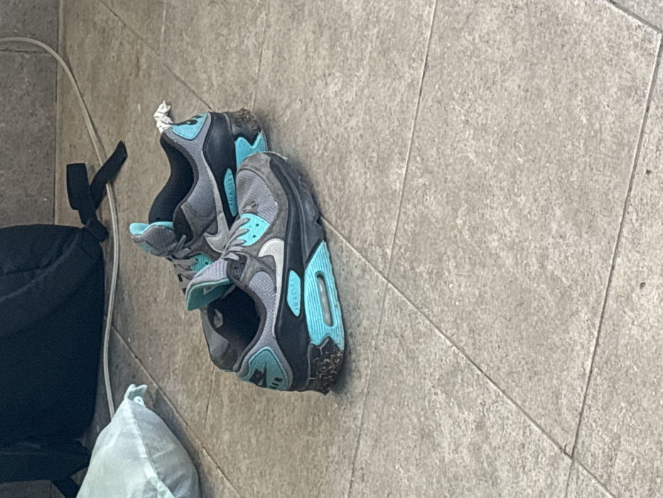 - "The image displays a pair of worn Nike Air Max 90 sneakers resting on a light-colored, textured tiled floor in Las Crucitas, Mexico" by FM-Yy1EH3, licensed under CC BY 4.0