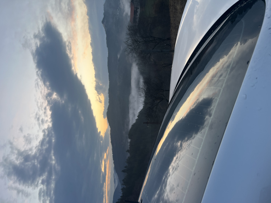 This image depicts a mountainous landscape at either sunrise or sunset, viewed from the rear of a white vehicle in Gradat, Bulgaria