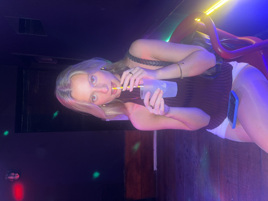 A young woman with long blonde hair and blue eyes is seated in a dark, club-like interior located in Lisbon, Portugal