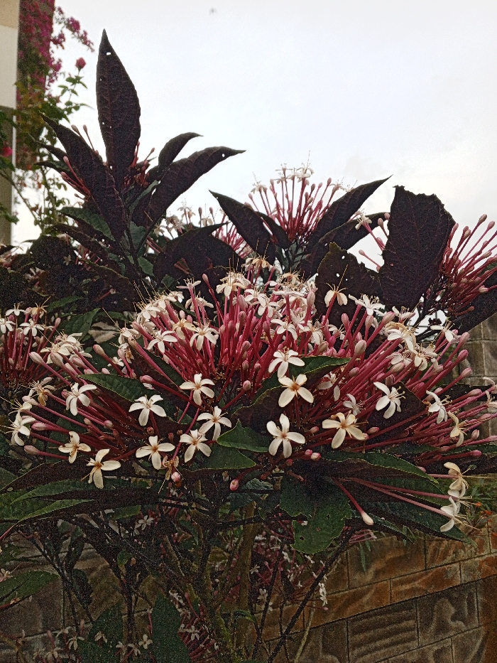 A close-up photograph taken in Batheay, Cambodia, depicts a dense cluster of flowering vegetation. The primary subject is a plant featuring numerous small, white, five-petaled flowers, each with an extended, delicate stamen cluster. These flowers emerge from slender, elongated, reddish-pink stems or calyxes, forming large, spherical inflorescences. The plant's foliage consists of dark green to purplish-brown leaves, some displaying small holes or minor imperfections. The background comprises a muted, overcast grey sky in the upper portion. To the far left, indistinct pinkish-red flowering foliage is partially visible against a light structure. In the lower right quadrant, a section of a light brown brick wall, characterized by its textured, rectangular units, is discernible. No human figures or discernible activities are present in the frame.