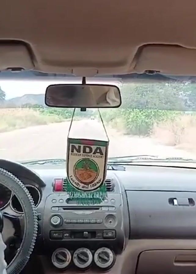 From inside the front cabin of a moving car, the view is towards the front windshield. A person in the driver's seat is steering, while another person is in the passenger seat. The road ahead is unpaved and lined with vegetation. A political banner, marked “NDA”, hangs from the rear-view mirror.