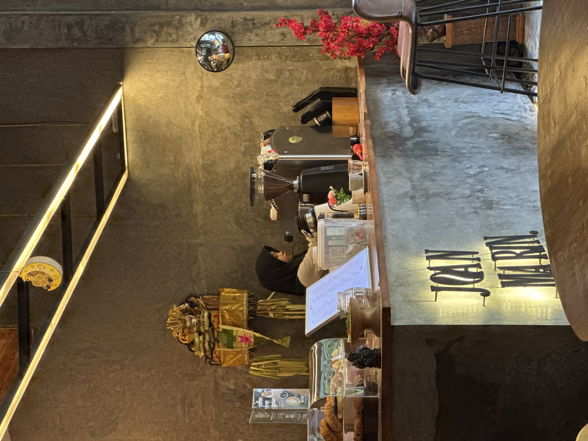 interior of a café named "Joan Martin" in Denpasar, Indonesia. A woman wearing a black headscarf is behind the counter, possibly working. On the counter, there is a coffee machine, a menu board, and display cases containing baked goods. Decorative traditional Balinese offerings, made of woven palm leaves and flowers, are placed near the counter. The walls are a dark grey, decorated with a round mirror and illuminated linear lighting. A set of high chairs can be seen near the counter.