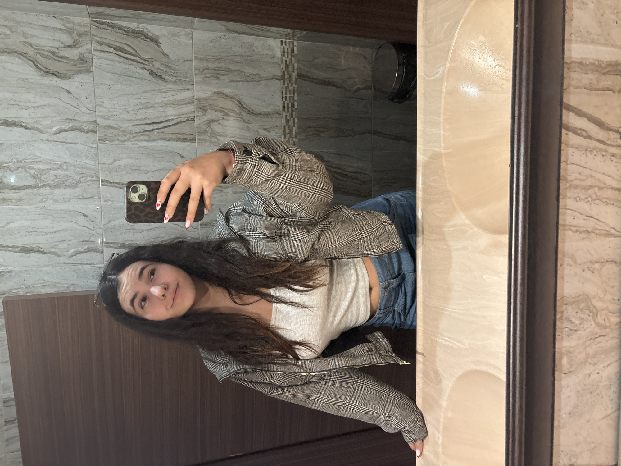 A young woman takes a selfie in a bathroom. The bathroom features gray, textured marble tiles and a brown wooden door. She wears a gray and white plaid jacket, a white top, and jeans. The selfie captures the reflection in a bathroom mirror. The image shows a sink, a trash can, and the bathroom's decor. The location is presumed to be Banya, Bulgaria.