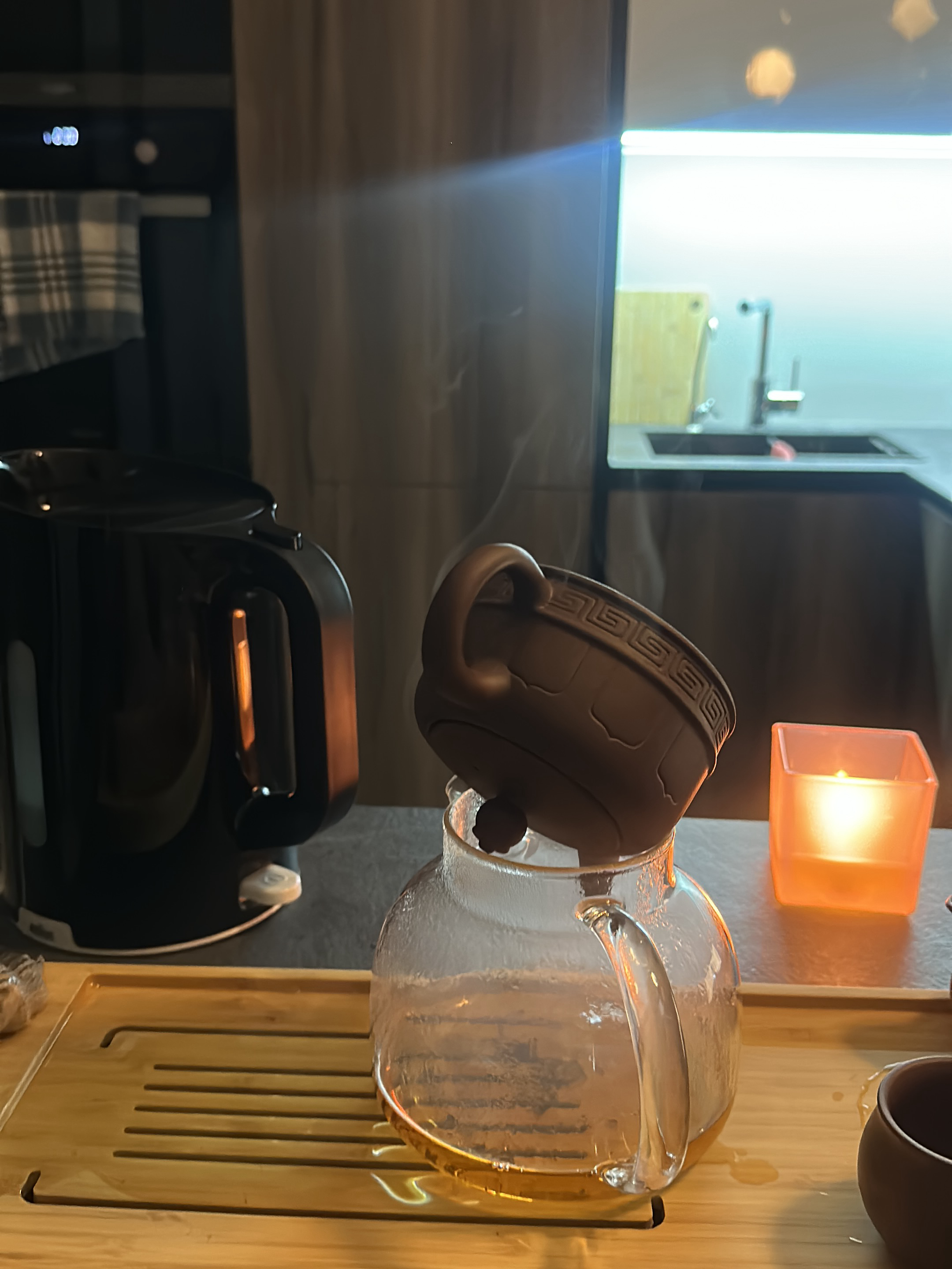 A medium shot shows a tea preparation scene in a room with modern décor. On a bamboo tray, a black electric kettle is positioned to the left of a glass pitcher with a brown clay teapot inverted on top. The pitcher contains amber-colored tea. A small, square candle holder with a lit candle is placed to the right of the pitcher. Smoke emanates from the pitcher/teapot area. In the background, an oven is visible to the left, and a kitchen counter with a sink is visible in the center. The scene is brightly lit, with light reflecting off the kitchen surfaces. The image does not offer enough information to determine that this image was taken in the city of Kyiv, Ukraine.