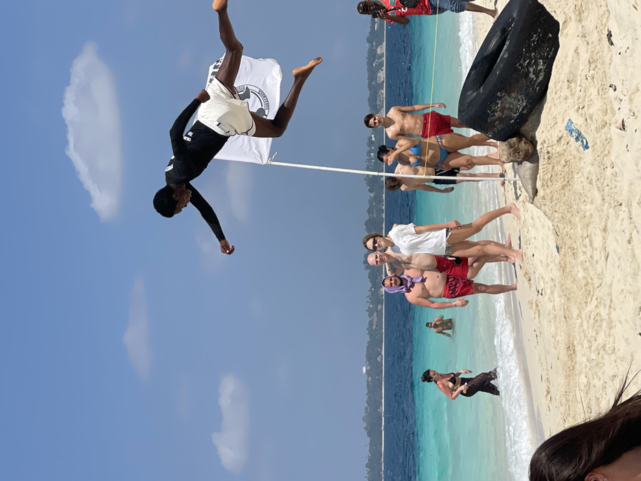 The image captures a sunlit beach scene in Zanzibar, Tanzania. A young Black male is suspended horizontally mid-air, approximately 3 meters above the white sand, arms extended forward, legs bent at the knees. He wears a black long-sleeved rash guard with white accents and white shorts, looking towards his extended left hand. Directly beneath him is a white flag displaying a circular black emblem, affixed to a white pole embedded in the sand. To the left of the flag pole, three light-skinned individuals are standing on the beach: a bald male with a purple cloth draped over his head, wearing red swim shorts; a female with sunglasses on her head, wearing a white polo shirt and light shorts; and another bald male in red swim shorts. Further back and slightly to the left, a light-skinned female in a dark bikini and patterned pants wades in the shallow, turquoise ocean water, alongside a partially visible bare-chested male in deeper water. To the right of the flag pole, three more individuals are positioned: a light-skinned male in dark swim shorts behind the pole; a light-skinned female in a blue bikini, covering her mouth with her hand; and a bare-chested male in red swim shorts. On the far right, a dark-skinned male in a red shirt and shorts is visible, holding what appears to be a mobile phone in a photographic stance. A large, black, worn vehicle tire is partially buried in the sand on the right side of the foreground. A piece of blue plastic debris lies on the sand nearby. A yellow rope or string stretches horizontally at knee height behind the people on the beach. The background features a clear blue sky with scattered white cumulus clouds, and a distant green landmass along the horizon. The extreme lower-left foreground shows the top of a head and shoulder of a person with brown hair, out of focus.