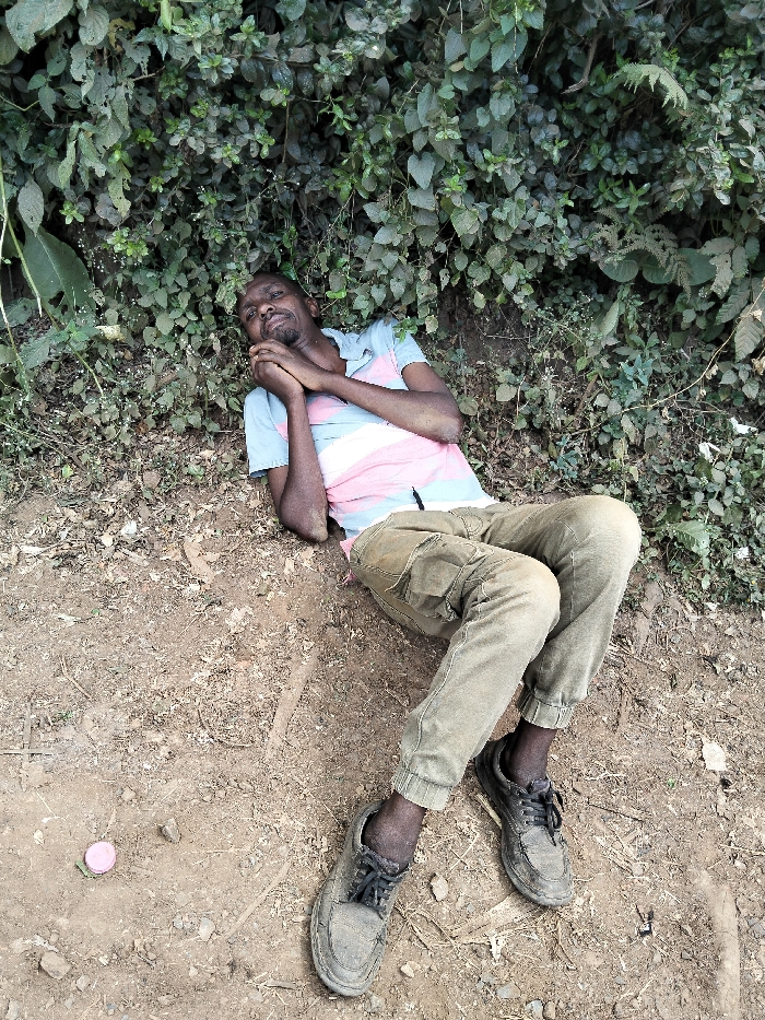 A man lies on the ground near a leafy green shrub