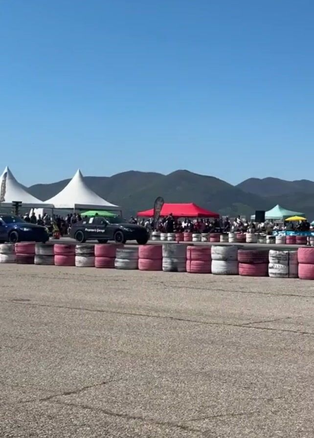 two cars drag racing down a concrete track, seen from behind a barrier of tires
