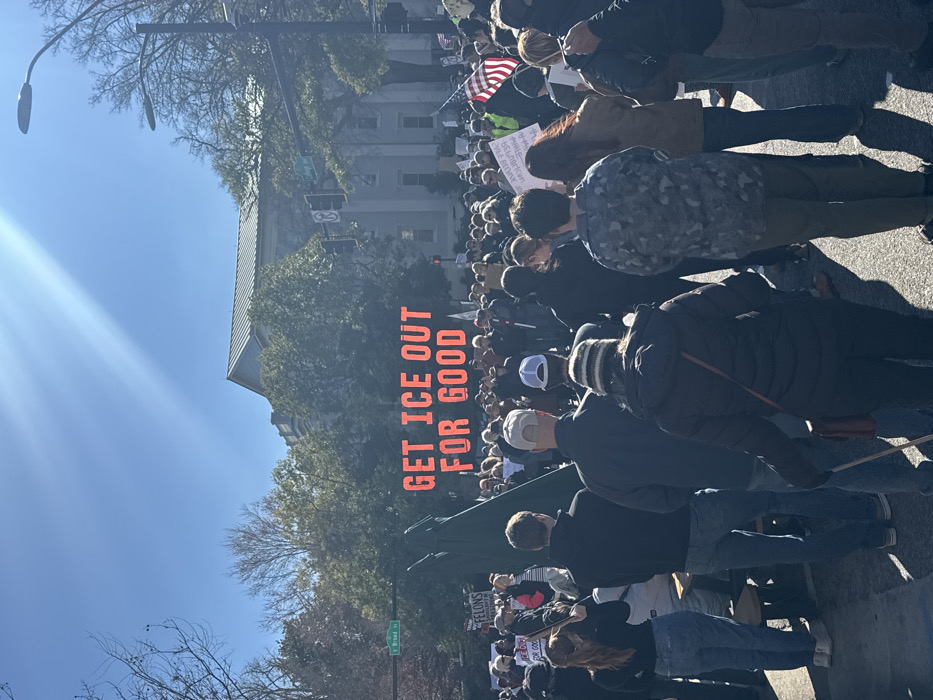 A daytime street protest features a dense crowd. A large electronic sign displays the message "GET ICE OUT FOR GOOD." The US flag is visible within the crowd. People hold signs and march down the street. The architecture of a tall building can be seen in the background with bare trees. "E Broad St" is written on the green sign on the street.