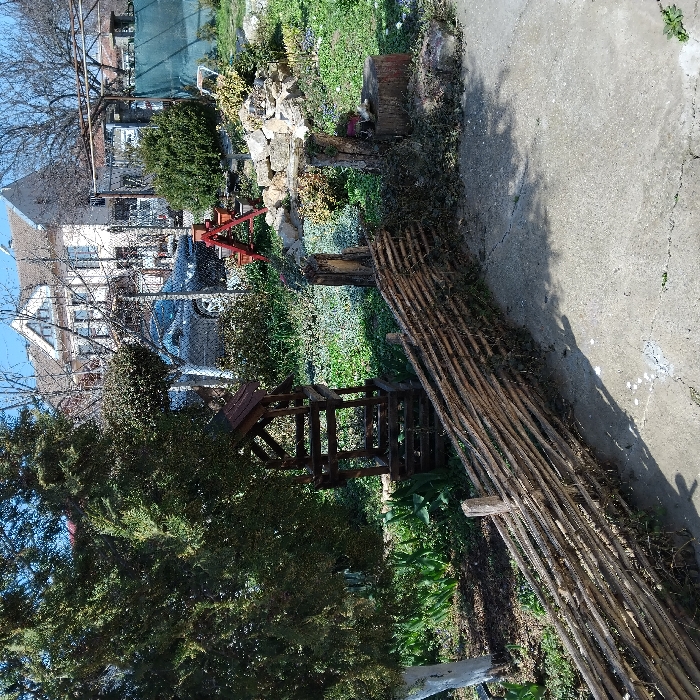 The image displays an outdoor residential setting in Levski, Bulgaria, under clear daylight. A concrete surface occupies the lower right and foreground, adjacent to a wattle fence made of interwoven branches that extends from the lower left. Beyond the fence, a garden area features green ground cover and scattered plants. On the left side of the garden, a tall, dark green coniferous tree with a white-painted base stands near a small, dark brown wooden decorative well structure with a sloped roof. Towards the center-right, two upright tree stumps are positioned within the garden, with a small red object resting on the top of the rightmost stump. A rock garden feature is visible behind the stumps, and a red wooden A-frame structure is present further back. In the background, a dark-colored sedan is parked behind a wire fence, in front of a light-colored, multi-story residential building with a prominent gable roof and several windows. Deciduous trees with bare branches are scattered throughout the background, and a section of fence covered by a green mesh or tarp is visible on the far right. The scene is illuminated by natural light under a clear blue sky.