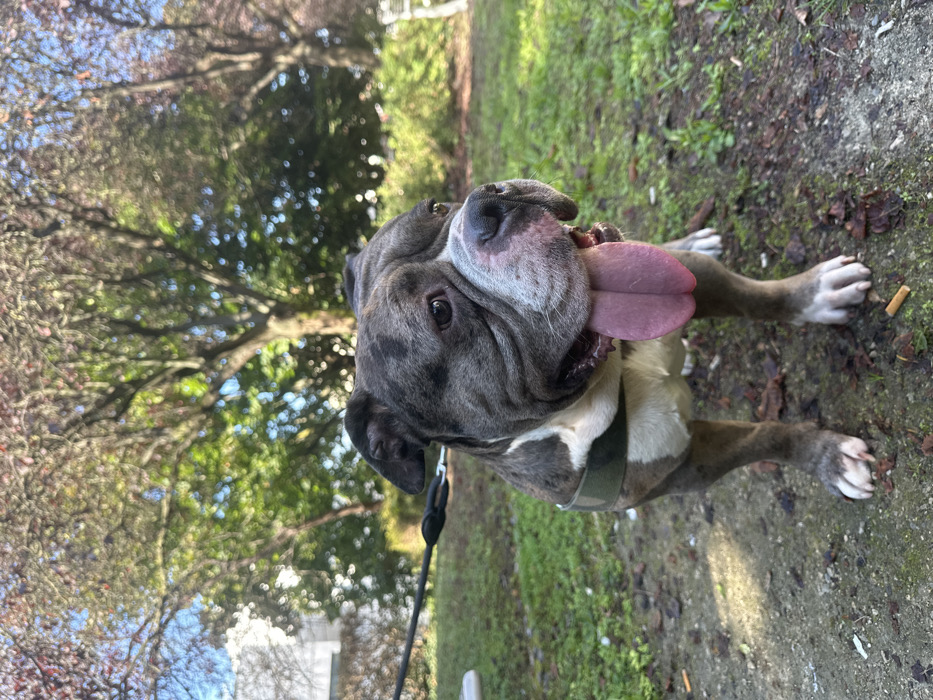 - "An American Bully type dog, displaying a blue merle and white coat pattern, stands on a dirt path with sparse grass and fallen leaves" by FM-clbjN2, licensed under CC BY 4.0