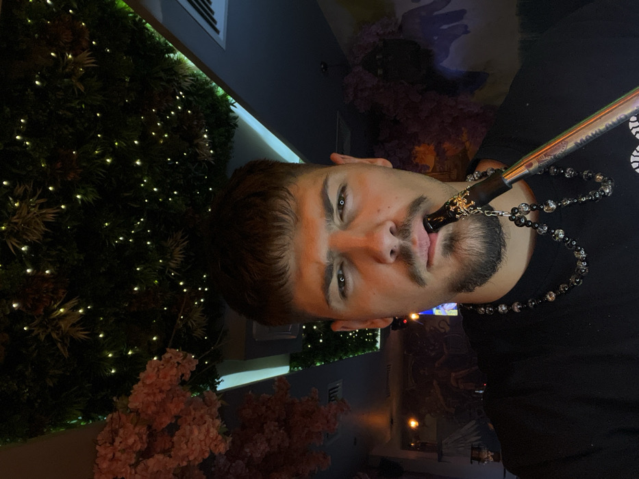 A young adult male, with a dark complexion, short dark hair featuring a fringe and faded sides, a mustache, and a goatee, is depicted in a close-up, chest-up shot