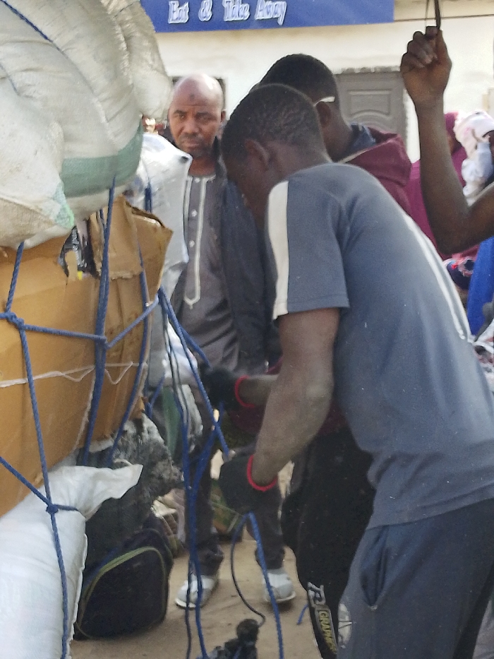 In Unguwa Uku Kauyen Alu, Nigeria, an outdoor scene depicts three males amidst cargo under bright daylight