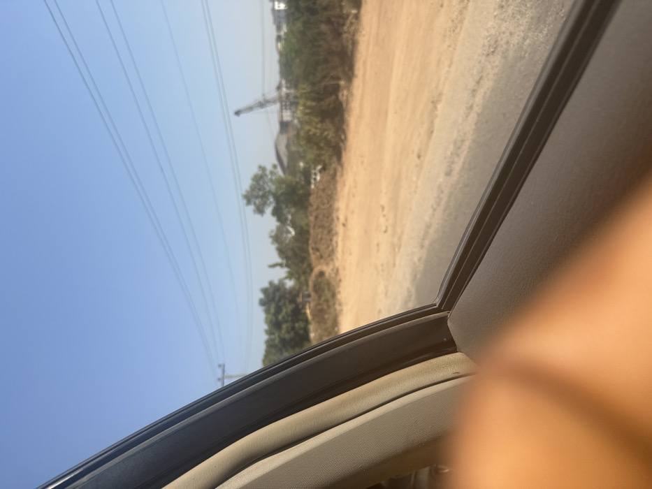 The image displays an exterior scene captured from within a vehicle in Karmajiji, Nigeria, under a clear, blue sky with moderate atmospheric haze. In the lower left foreground, a partial, out-of-focus human hand is visible, positioned near the vehicle's beige upholstered door panel and dark window frame. Outside, an unpaved, reddish-brown dirt road or area extends across the midground. Scattered dry vegetation and green trees line the far side of this expanse. In the background, a utility pole with multiple overhead power lines is visible. Further in the distance, various buildings are discernable, including one with a light-colored roof, and a large, dark construction crane is prominent against the horizon, indicating ongoing development or industrial presence. No direct human figures are clearly depicted beyond the partial hand.