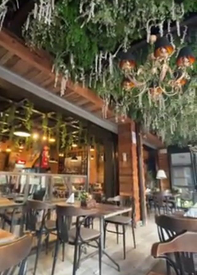 The video displays an outdoor seating area of a restaurant or cafe, viewed from a table