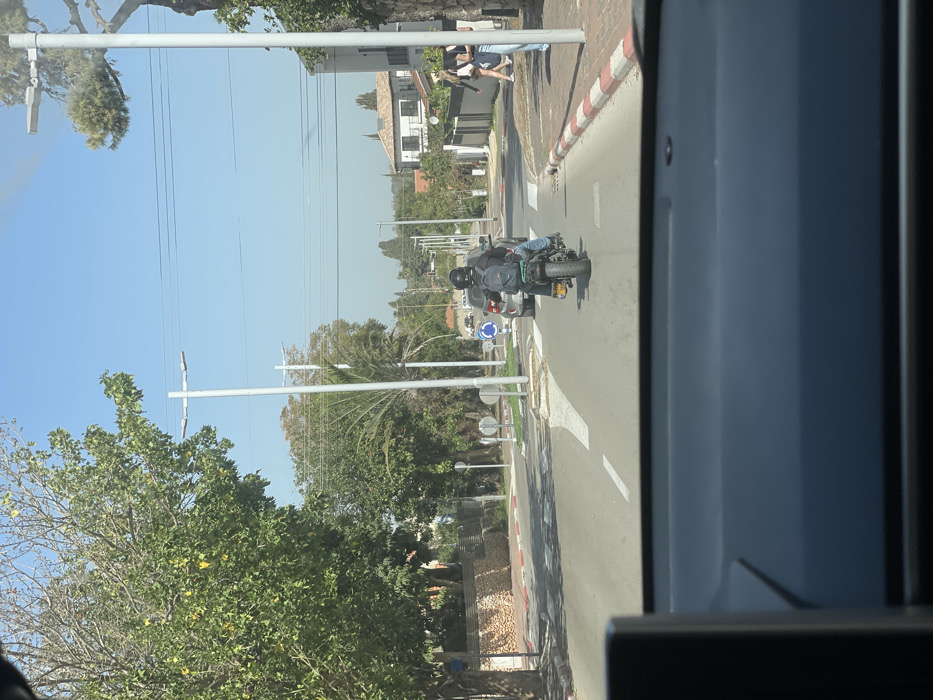 The image depicts a daytime street scene in Kfar Saba, Israel, viewed from inside a vehicle looking forward. The sky is clear and blue. In the immediate foreground, the dark dashboard of the originating vehicle is visible, occupying the bottom portion of the frame. Ahead, an asphalt road extends with clear white lane markings. A small, landscaped median or roundabout is present in the road, outlined by red and white striped curbs. A male individual on a dark-colored motorcycle is positioned centrally on the road, traveling away from the camera. He wears a dark helmet, a dark jacket, light blue jeans, and a light-colored backpack. Directly behind the motorcycle, a grey sedan or SUV is partially visible, also moving forward. On the left side of the road, a segment of a retaining wall constructed from light-colored stones is visible, behind which dense green foliage and trees rise. On the right side, two pedestrians are walking on a paved sidewalk. One individual wears a light-colored top and dark shorts. The street is lined with mature trees, including both deciduous types with green leaves and palm trees. Tall, slender streetlights with modern LED fixtures are spaced along the roadside. In the midground and background, residential buildings with distinct tiled roofs are visible, interspersed with further greenery. Overhead power lines span across the upper portion of the scene. The distant horizon shows a line of trees against the clear sky, indicating slightly varied terrain.