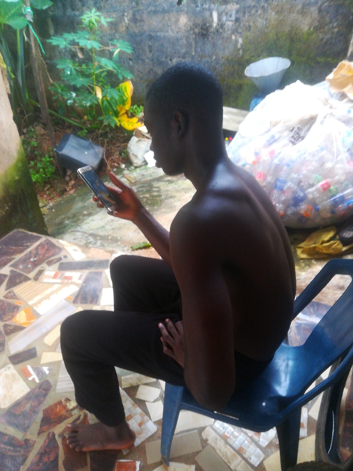 - "A shirtless male with dark skin and a lean build sits barefoot on a faded blue plastic chair, facing left and looking down at a dark-colored smartphone held in his right hand" by FM-PZKt42, licensed under CC BY 4.0