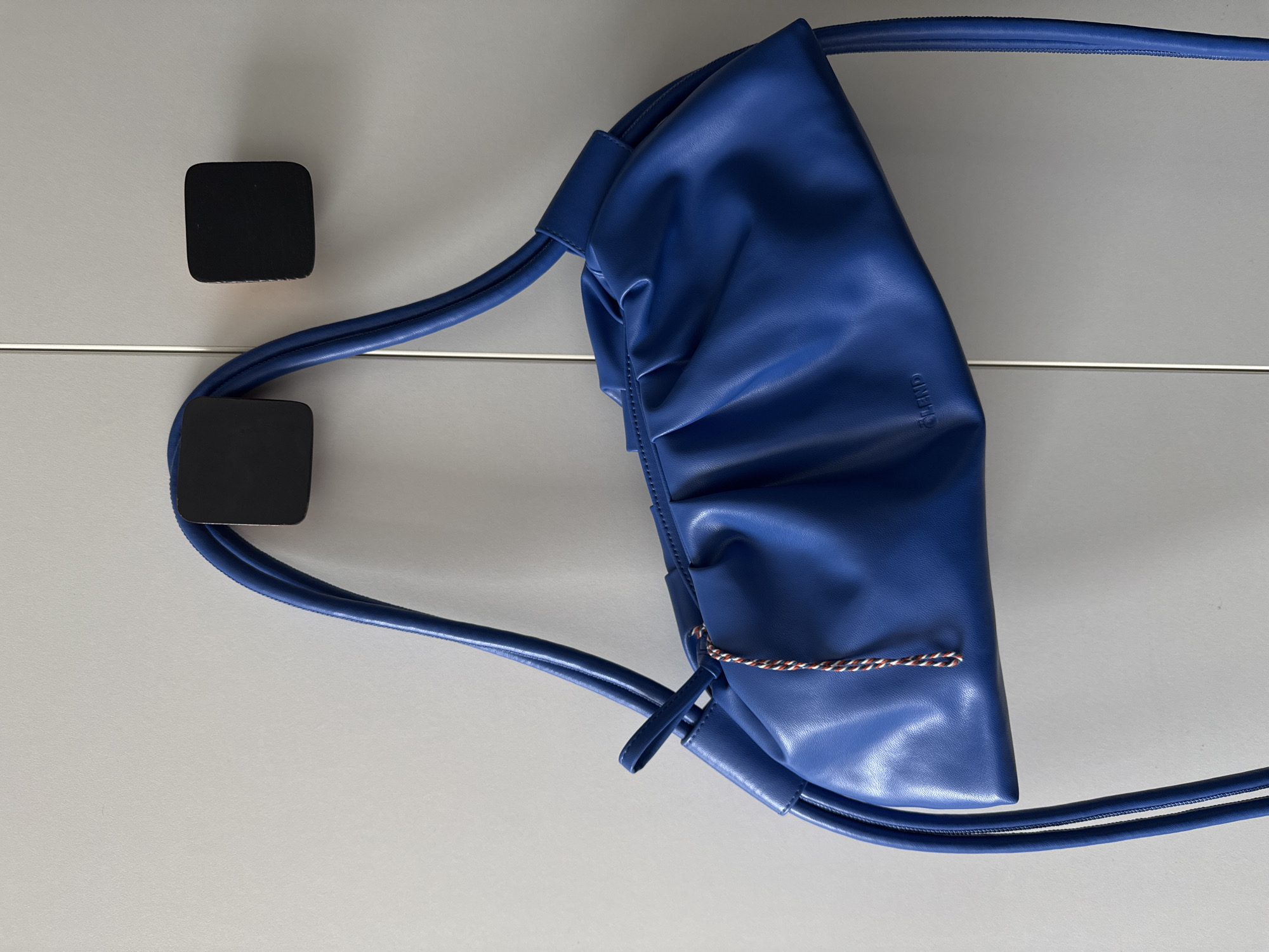 - "A royal blue, gathered-style handbag, appearing to be crafted from leather or a high-quality synthetic material, is suspended by its two slender straps from two black, square-shaped wall hooks" by FM-Gswv13, licensed under CC BY 4.0