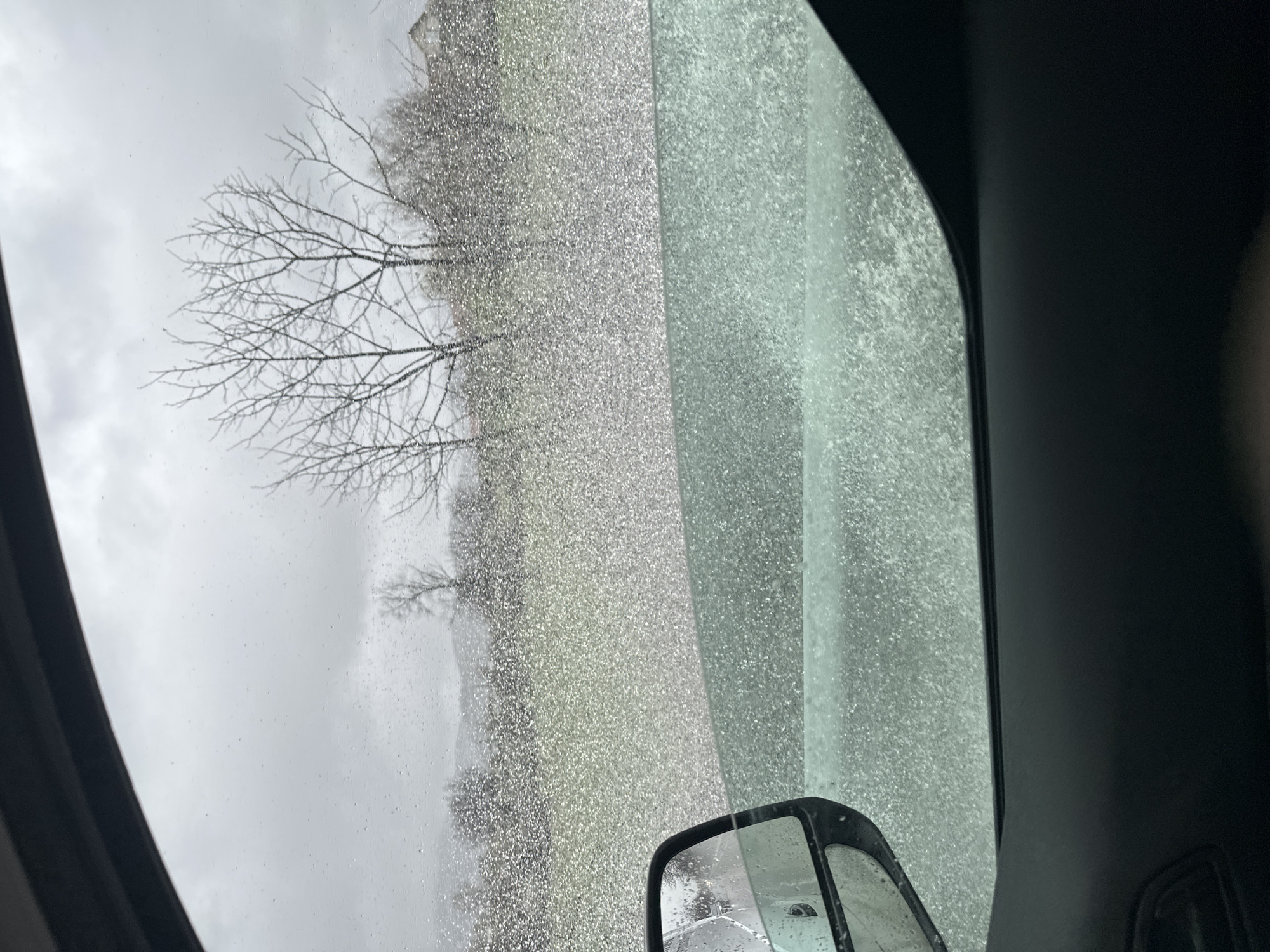 The image appears to be taken from inside a vehicle on a rainy day