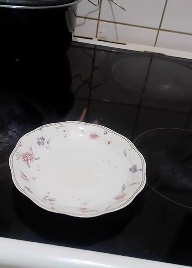 small white bowl with a floral pattern sitting on a black stovetop. There are brief flashes of flame underneath the bowl. A large black pot with a silver lid sits to the left of the bowl on the stovetop. The stovetop is surrounded by white tiled walls.