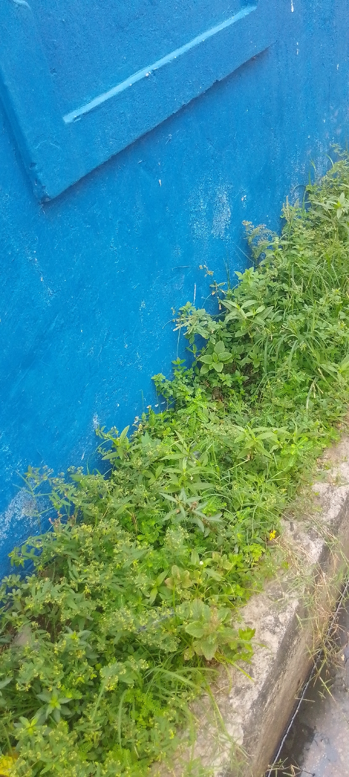 The image depicts an outdoor scene in the city of Unknown, Unknown. The upper-left two-thirds of the frame are dominated by a vibrant, textured blue vertical surface, identified as a wall or structural panel. This blue surface exhibits raised linear moldings, creating a diagonal pattern. Evidence of wear, including scuff marks and lighter patches, is present on the blue paint. The lower-right portion of the image features a dense, uncontrolled growth of various green vegetation, including weeds, grasses, and small leafy plants, extending from the base of the blue structure. A few small yellow flowers are visible within the foliage. A light grey concrete curb runs diagonally across the bottom right, bordering the dense vegetation. Adjacent to the curb, a dark, reflective area suggests the presence of standing water or a drainage channel. No individuals or animals are present in the scene, and no specific actions or interactions are depicted. The environment appears neglected or naturalized in an urban or semi-urban context under daylight conditions.