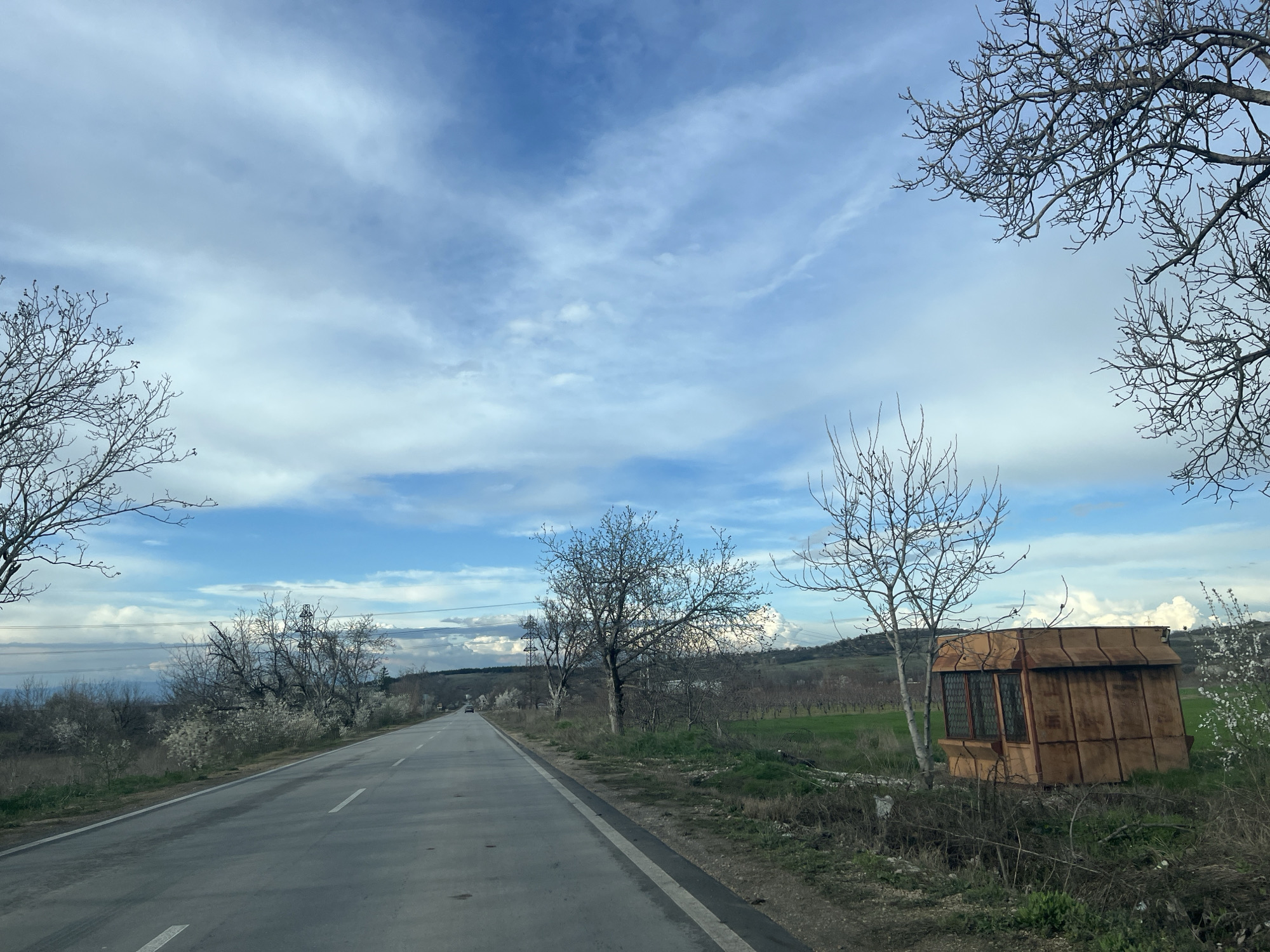 The image displays a rural road scene near Perushtitsa, Bulgaria, under a sky featuring both clear blue patches and extensive white and light grey clouds. A two-lane asphalt road, marked with a solid white line on its right edge and a broken white line in its center, recedes into the distance from the foreground. On the left side of the road, a narrow dirt and grass verge borders a landscape characterized by numerous deciduous trees, many of which are bare, while others exhibit early white blossoms. Utility poles with overhead lines are visible in the mid-ground, with distant hills or mountains forming the horizon. A single dark-colored vehicle is discernible in the far distance, traveling away from the viewer on the left side of the road. On the right side of the road, a grassy verge leads to a small, weathered, roughly rectangular wooden structure. This structure, appearing to be a kiosk or shelter, is constructed from reddish-brown wooden panels with signs of age and features a slightly angled roof. Its side facing the road includes a window section composed of multiple small, dark-framed panes. Immediately to the left of this structure stands a bare deciduous tree with thin branches. Beyond the structure and verge, a field of green vegetation, possibly crops, extends towards a treeline and further distant hills. Several small white blossoms are also present behind the wooden structure and to its right. Bare tree branches partially frame the upper left and right corners of the scene. No individuals are visible.