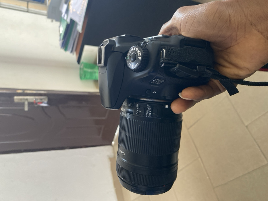 A dark-skinned right hand, with a visible white fingernail on the index finger, grips a black Canon EOS 60D DSLR camera