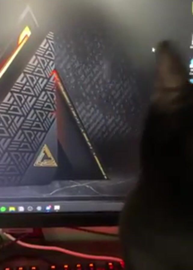 A cat sits in front of a computer monitor and a keyboard. The monitor displays a geometric wallpaper pattern, and the computer icons are visible in the upper right corner. The keyboard is red-lit. The cat's dark fur is visible from behind. The cat's ears twitch as it looks at the screen.