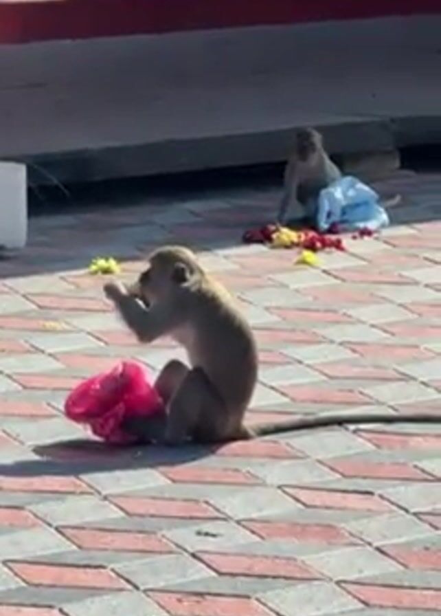 two monkeys on a patterned brick patio. One monkey sits next to a pink plastic bag and eats a banana. Another monkey is in the background near a blue bag and some flowers and fruit scattered on the ground. People walk by. One monkey picks up the pink bag and runs with it across the patio. A pigeon also walks across the patio.