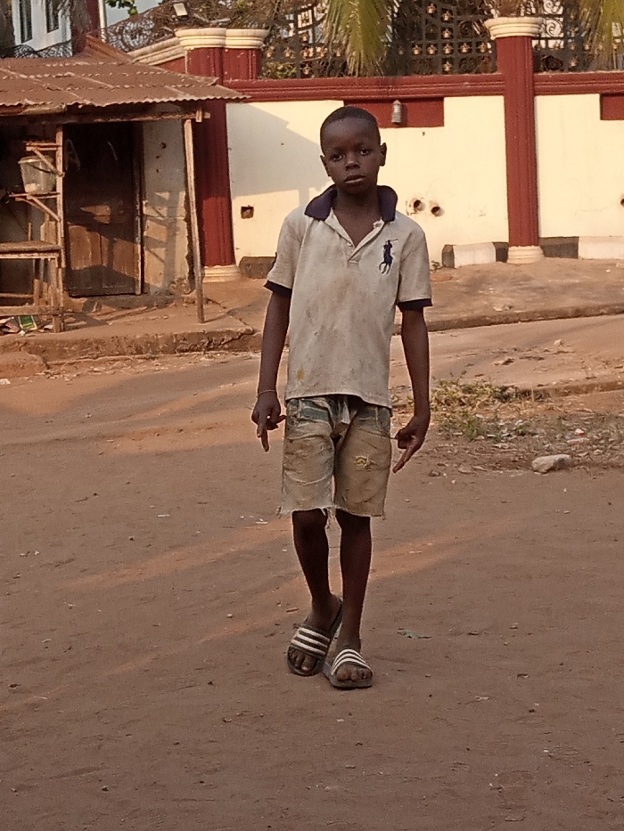 A young boy in worn clothing walks towards the camera. He wears a dirty polo shirt, frayed denim shorts, and striped sandals. His hands are pointed downwards, one at each side. He stands on a dirt road in front of a building with a reddish-brown roof. A white fence with red columns stands behind him. The scene is bathed in warm light, suggesting either sunrise or sunset.