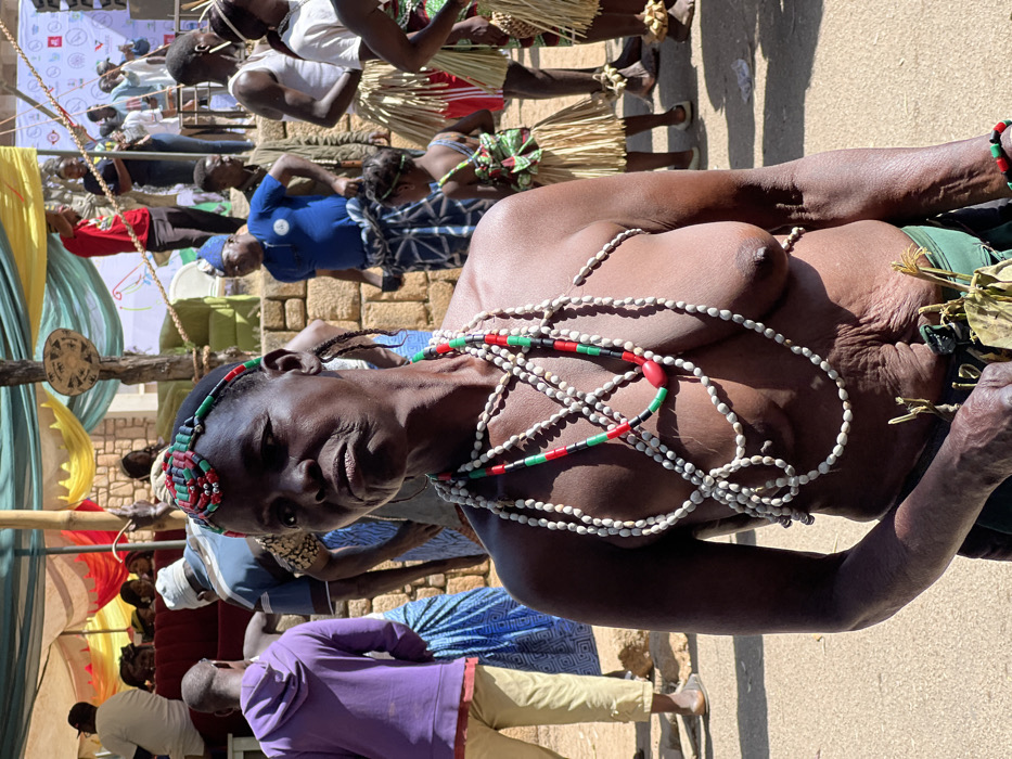 An adult woman stands in the foreground, facing slightly left with a neutral expression. She has dark skin, braided hair on the sides of her head, and wears a beaded headband in red, green, and black. Multiple strands of necklaces, primarily white shell beads, adorn her bare chest, with one prominent necklace featuring red, green, and black cylindrical beads and a red ovoid bead at the center. Her left hand holds a small bundle of dried plant material, and her lower body is partially covered by a green garment. The scene unfolds outdoors under bright daylight, with a dusty ground surface. In the mid-ground and background, numerous individuals are visible. To the woman's left, a man in a purple hoodie and khaki pants stands. Further back, a man in a blue t-shirt and patterned blue and white wrapper is seen, alongside a small child in a patterned top and a tan straw skirt. Several other individuals, some wearing traditional attire including straw skirts and ankle decorations, are distributed across the background. A raised stone or concrete platform runs horizontally behind the main subjects. Overhead, colorful fabric awnings (yellow, green, red) indicate a temporary structure, possibly a tent or canopy. In the upper right, a white banner or screen displays several logos, including "WhatsApp." The setting is a public gathering, likely a cultural event or festival in Jos, Nigeria.