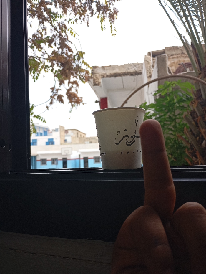 The image displays an outdoor urban scene in Damascus, Syria, viewed from an interior through a dark-colored window frame. A white disposable coffee cup, printed with black Arabic script and the English word "FAYROZ", rests on the lower window sill. In the lower right quadrant, a human hand with medium-dark skin tone is raised, presenting an extended middle finger towards the scene. Beyond the window, an overcast sky fills the upper portion. To the left, a light blue and white building is visible, featuring a basketball backboard and hoop. A tree with sparse, predominantly brown and green foliage occupies the mid-left. Towards the right, a palm tree's fronds are partially visible. The background reveals several older, weathered buildings with light-colored facades, one exhibiting a red window or door frame, consistent with an urban environment in Damascus.