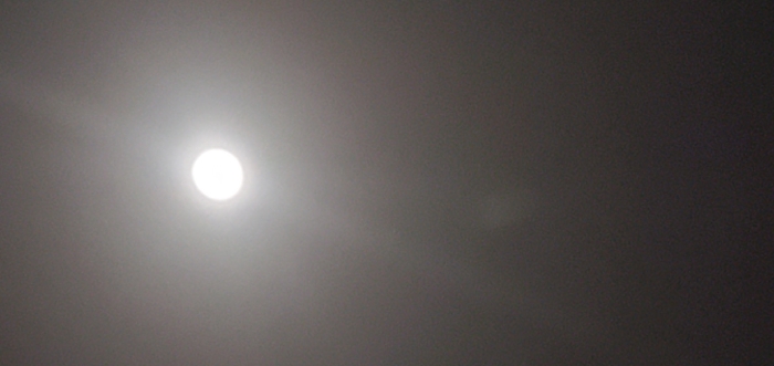 A bright, circular light source dominates the upper left of the image, radiating intensely within a hazy, gray atmosphere. The surrounding area fades into a uniform dark gray or black, suggesting either a night sky obscured by clouds or fog, or a poorly lit indoor space. The light source itself lacks discernible features, appearing as a plain disc. A faint, indistinct artifact is visible in the mid-right area.