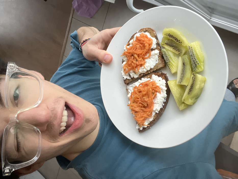 This image, captured in Villeneuve-d'Ascq, France, depicts a light-skinned male with short dark hair, clear-framed glasses, and light stubble on his face. He is wearing a teal t-shirt and a multi-colored beaded bracelet on his right wrist, with a dark sandal partially visible on his left foot. The individual is positioned looking directly at the camera, winking with his right eye, and smiling with his mouth open, revealing his upper and lower teeth. He holds a white circular plate with both hands, presenting its contents towards the viewer. The plate holds two slices of dark bread, each topped with a layer of white cottage cheese or similar dairy product, covered with shredded orange carrots. Alongside these, six peeled segments of green kiwi fruit are arranged. The background reveals an indoor setting with a light-colored tiled floor in the lower right and a light brown wooden surface or furniture in the upper right. A purple bag or object is partially visible on the floor in the mid-right background.