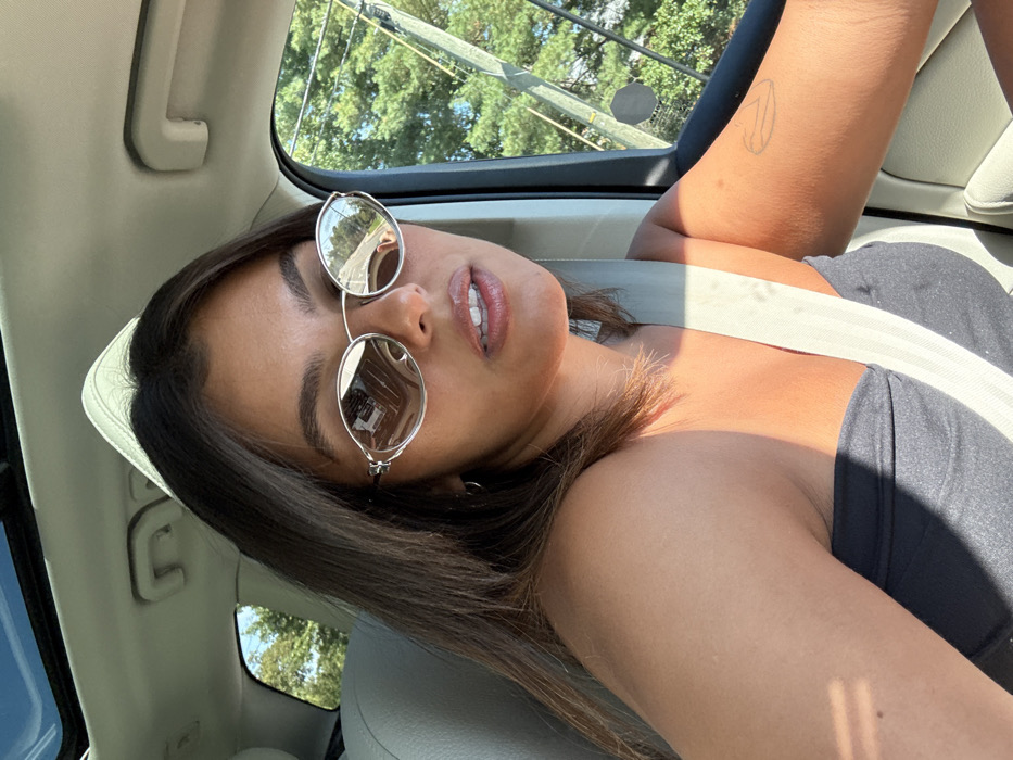 A female individual is seated in the driver's position of a vehicle in West Windsor, United States, taking a selfie. She has dark brown hair, dark eyebrows, and is wearing silver-framed, oval sunglasses with reflective lenses, a dark strapless top, and a light-colored seatbelt across her chest. Direct sunlight illuminates her right side, revealing tanned skin and a faint, linear tattoo on her right upper arm. Her lips are slightly parted. The vehicle's interior features a light-colored headliner, a visible sunroof, and an overhead grab handle. Through the driver's side window and reflected in her right sunglass lens, green foliage, utility poles, overhead wires, and a road are visible under a clear blue sky. The reflection in her left sunglass lens shows architectural elements, possibly from a nearby building.