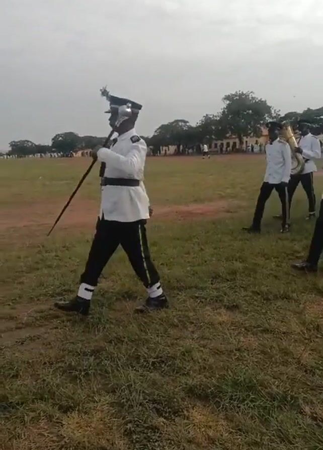 A marching band is parading across a grassy field. The band members are wearing white uniform shirts, black pants, and peaked caps, except for the leader who is holding a baton and is wearing a full white uniform. The band members are carrying brass instruments, mostly tubas, trumpets, and trombones. The band is playing a marching tune. In the background, there are trees and buildings. The sky is overcast.