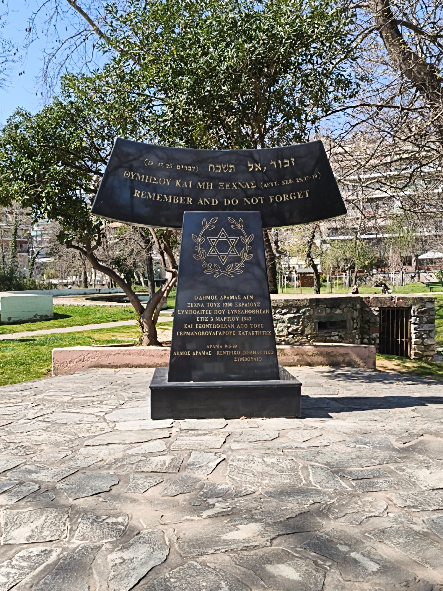 A dark-colored Jewish Holocaust memorial stands centrally in a park in Drama, Greece, under a clear blue sky. The multi-component monument consists of a rectangular base, a central vertical stele, and an angled top slab. Inscriptions in Hebrew, Greek, and English on the top slab read "REMEMBER AND DO NOT FORGET," referencing Deuteronomy 25:17-19. The central stele features a Star of David encircled by olive branches, with Greek text below it. This text specifies the memorial commemorates 1200 Jewish citizens of Drama who were arrested and exterminated by German-Bulgarian occupiers on March 3, 1943. It further indicates the memorial was dedicated on May 9, 1999, by the Municipality of Drama and the Central Board of Jewish Communities in Greece. The memorial rests on a paved area composed of irregular gray flagstones. This paved area is surrounded by green grass and a variety of trees, some with full green foliage and others with bare branches, indicative of seasonal changes. In the mid-ground, a low stone wall with a metal grate entrance and light green concrete structures are present. Further into the background, two indistinct individuals are visible, seated within the park area, with multi-story urban buildings partially obscured by trees beyond them. The scene is illuminated by natural sunlight.