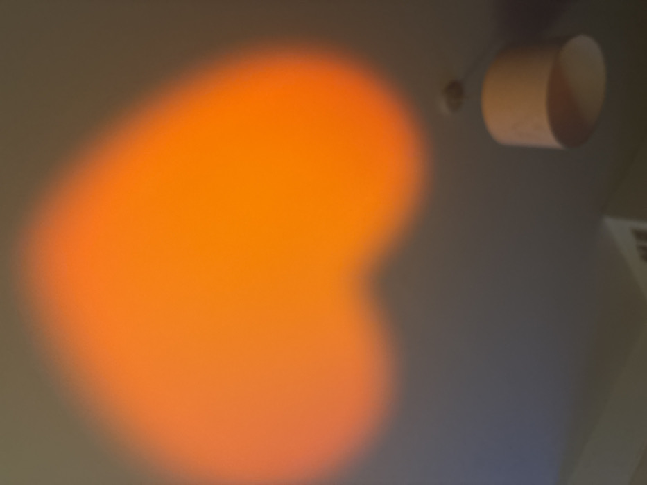 This image depicts an unfocused interior scene located in the city of Manchester, United Kingdom. The primary subject is a large, highly diffused, bright orange light projection shaped distinctly like a heart, cast upon a light-colored ceiling. The edges of this orange heart are soft and blurred, indicative of its unfocused nature. Suspended from the ceiling, towards the lower right portion of the frame, is an off-white or light beige cylindrical pendant light shade, which is also out of focus. A white structural element, possibly a wall or corner of furniture, is partially visible in the lower left quadrant. The overall environment appears to be a dimly lit room, with no individuals, actions, or interactions present. The entire composition is significantly blurred, lending a soft, indistinct quality to all elements.