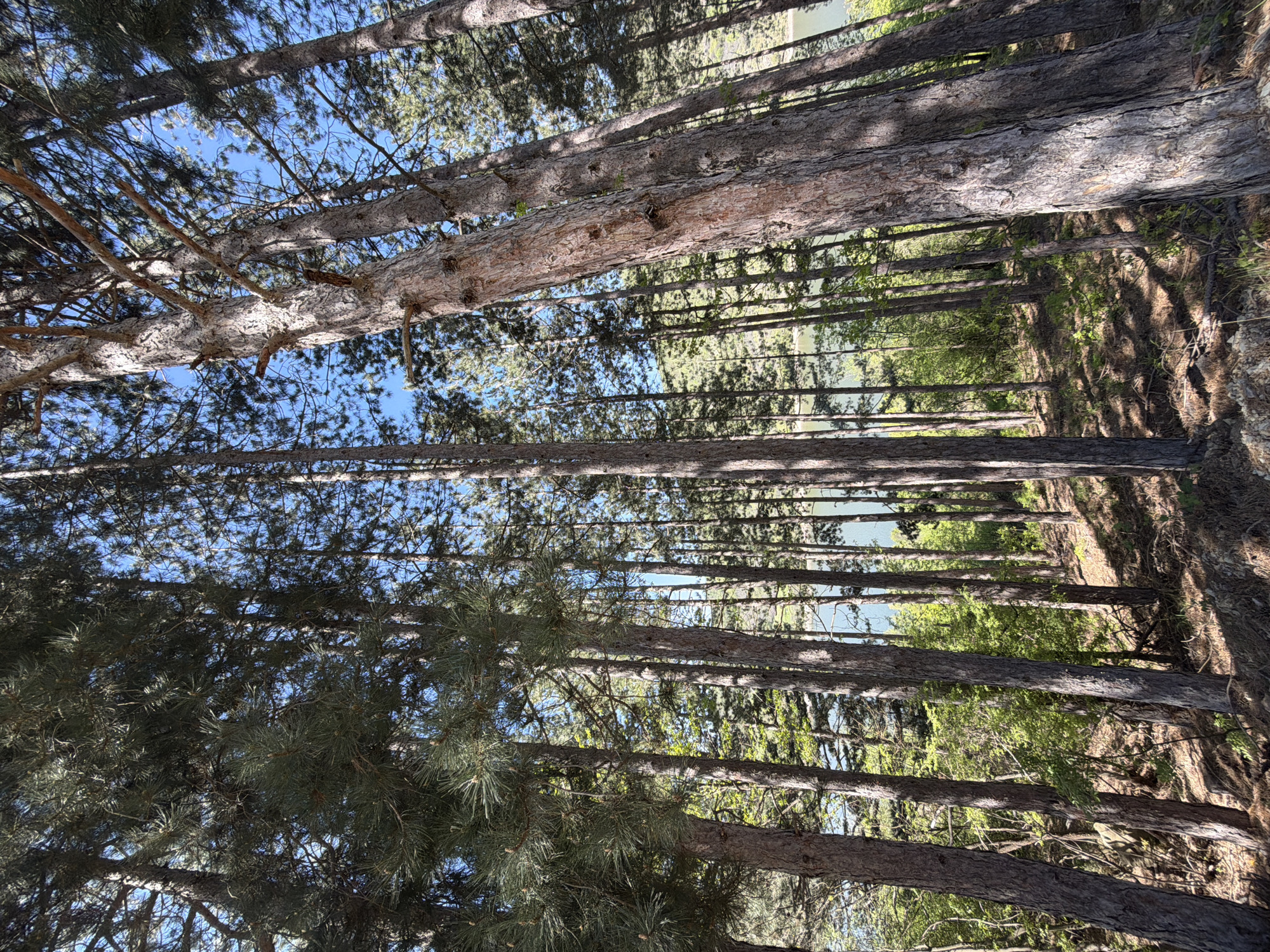 forest scene in Padartsi, Bulgaria. The ground is covered in brown leaves and pine needles. The forest consists of tall, thin trees with light bark, some of which have green pine needles. The sky is visible through the trees and is a clear blue.