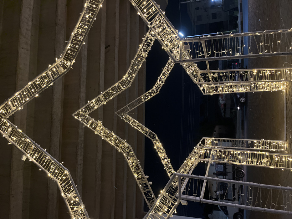 several white, angular structures outlined with warm white lights, possibly stars, against a backdrop of concrete and a dark night sky. Some structures are affixed to a building. The lights create a repeating geometric pattern. Distant buildings, parked vehicles, and streetlights are visible.
