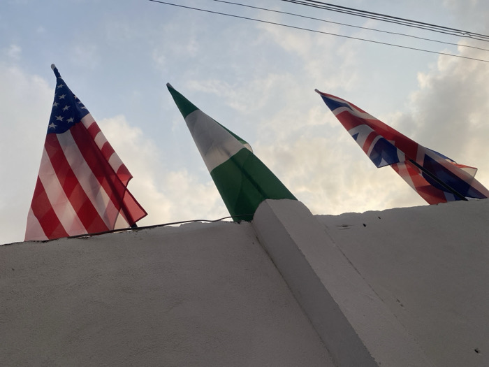 Three flags are displayed atop a white structure against a backdrop of a cloudy sky. From left to right, the flags represent the United States of America, Nigeria, and the United Kingdom. The flags appear to be slightly weathered and angled. A few power lines are visible in the upper portion of the image. The lighting suggests either dawn or dusk.