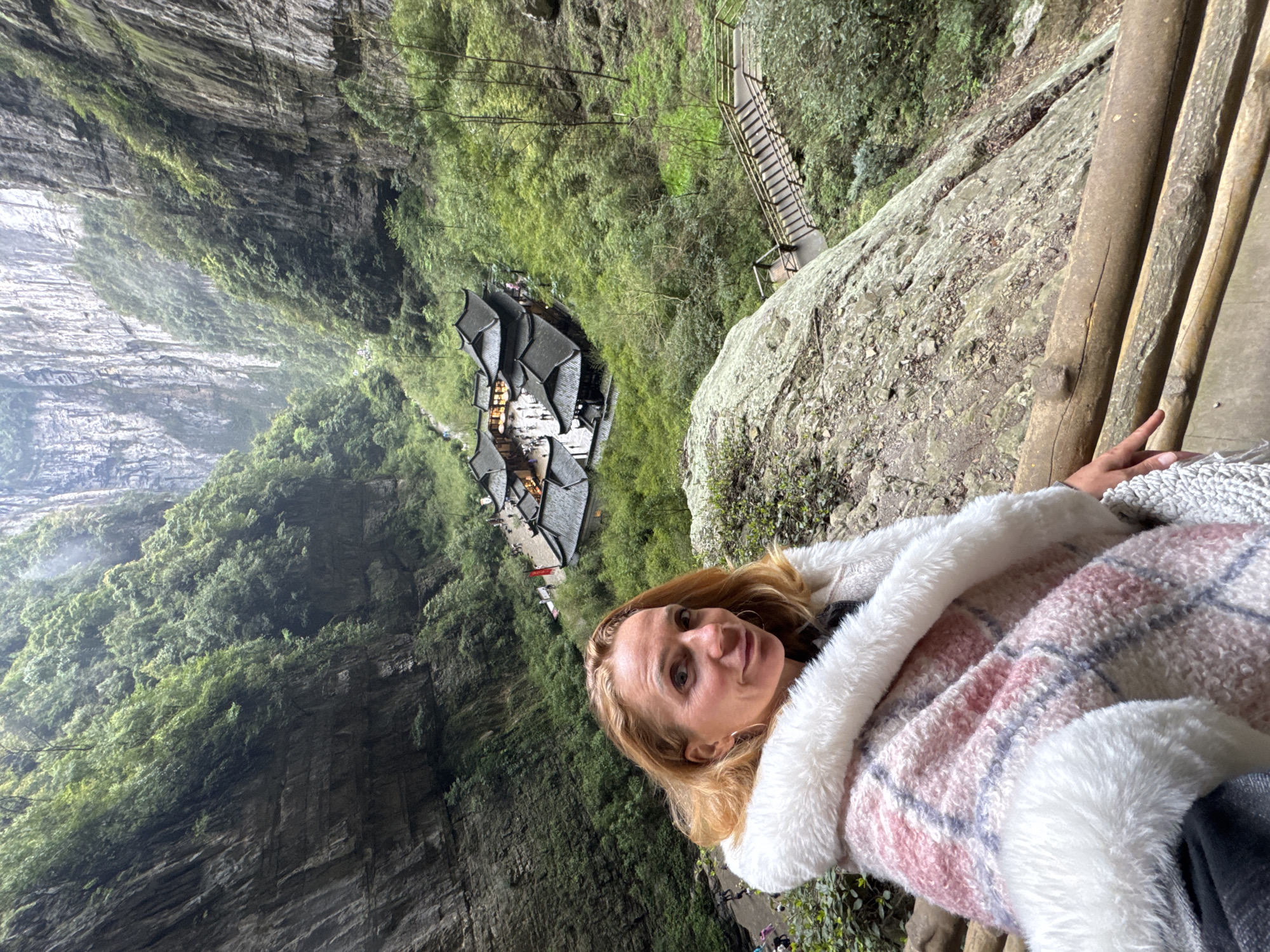 A woman is pictured from a low-angle perspective. She is facing the camera with her head tilted slightly, giving a curious expression. She wears a white and pink plaid blanket-like coat with a thick, fuzzy trim. Her hair is blonde and styled in loose waves. She is holding onto a weathered, wooden railing or structure. Behind the woman, the landscape plunges into a deep, lush gorge. The steep, rocky walls are covered in dense vegetation. At the bottom of the gorge, there is a traditional Chinese building complex. A pathway with steps is visible to the right, leading to the structure. The setting appears to be scenic and mountainous, reminiscent of a natural landscape in Wulong District, China.