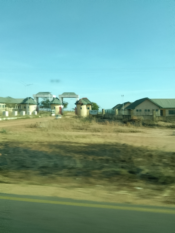 The scene shows a roadside view of buildings, likely in a rural or suburban area. Structures include several buildings with green roofs and light yellow walls, two cylindrical buildings with reddish-brown roofs, and a large, arched entrance. A road is visible in the foreground with dry, grassy areas in between. The sky is clear and blue. The photograph may have been taken from inside a moving vehicle, given the blurred road and foreground.