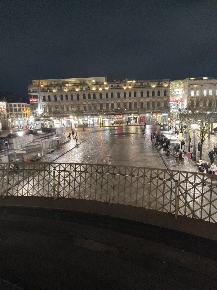The image depicts Place Saint-Lambert in Liège, Belgium, observed from an elevated perspective at night. The sky is dark and featureless. In the immediate foreground, a metallic railing with a geometric crisscross pattern extends horizontally across the frame, positioned above a dark, indistinct surface. The midground is dominated by the expansive urban plaza, which is visibly wet and reflective, indicating recent precipitation. On the left side of the plaza, a series of light-toned, angular concrete or stone structures are present, near which several individuals stand or walk. The central area of the plaza is open, traversed by a few solitary pedestrians. On the right side, a covered public shelter or bus stop is visible, populated by approximately 10-15 individuals, some seated on benches and others standing. Bare trees stand adjacent to this shelter and further to the right. The background features a prominent, multi-story building with a light-colored facade, characterized by multiple arched windows evenly illuminated on its upper levels. The ground floor of this building houses various retail establishments, including a "HEMA" store, with their signs and interiors brightly lit. To the right of this central structure, a large glass building featuring the illuminated sign "GALERIES ST LAMBERT" is visible. Further to the left, another modern building with an "m'aarkt" (or similar) sign and additional illuminated storefronts completes the streetscape. The entire scene is illuminated by artificial streetlights and building lights, with their reflections visible on the wet plaza surface.