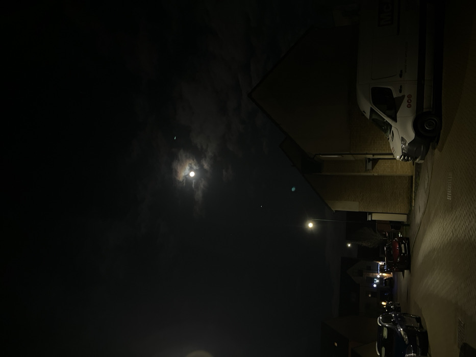 Night scene featuring the moon amidst scattered clouds, accompanied by a slender crescent nearby. A white van is parked along a brick building, with streetlights illuminating the road lined with parked cars. The sky is largely dark, contrasting with the artificial light sources below.