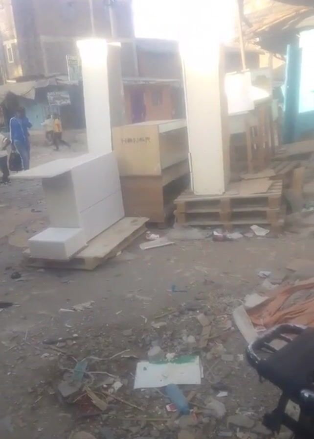 street scene with various objects and people. There are several pieces of furniture, including a white cabinet, a wooden shelf with "HONOR" written on it, and some other wooden structures possibly made from pallets. These objects are placed on the ground amidst debris and trash. There are people visible in the background, some walking and others standing. A motorcycle passes by in the distance. The scene appears to be an outdoor area with a mix of dirt, gravel, and discarded items scattered around. The lighting is bright, creating some glare in the frame.