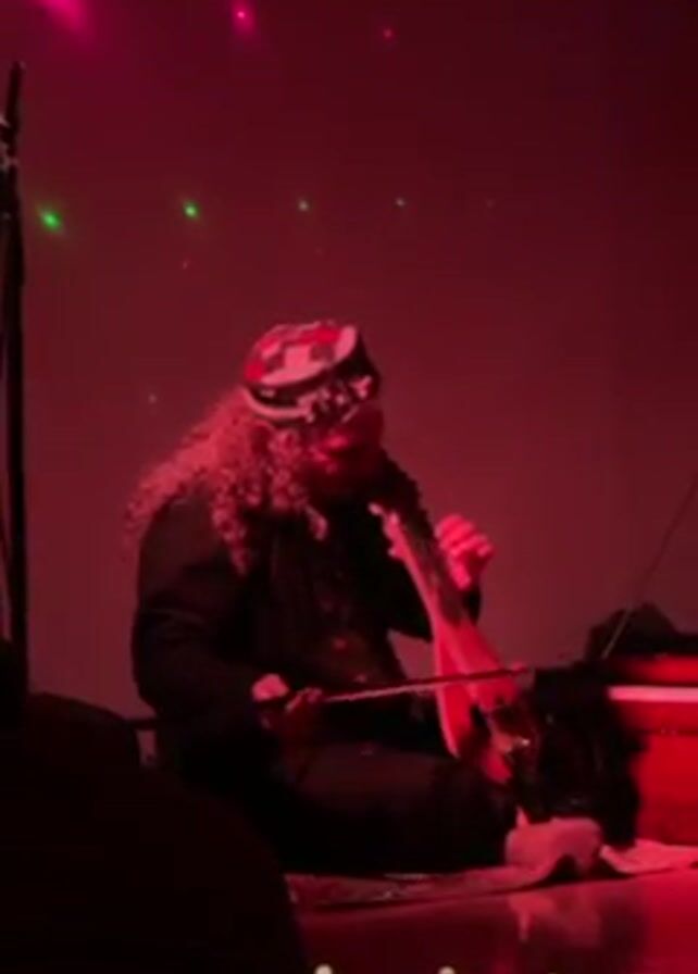 A person is seated on a rug on the floor, playing a bowed string instrument that looks similar to a violin. The person is wearing a hat and dark clothing, and they have long, curly hair. The lighting in the room is red, and there are some green light effects on the wall behind the person. A microphone stand is visible to the left of the person, and a small, red box is behind them. The foreground shows parts of silhouetted viewers.